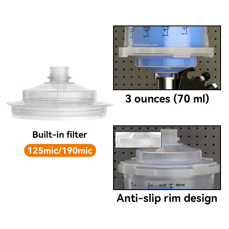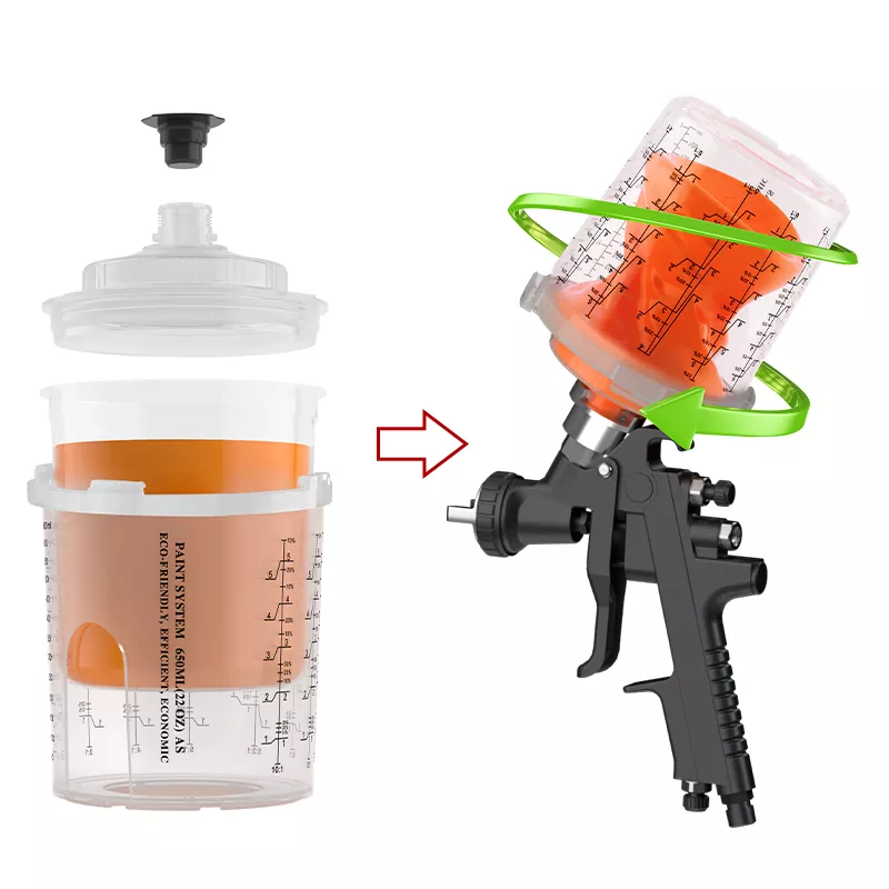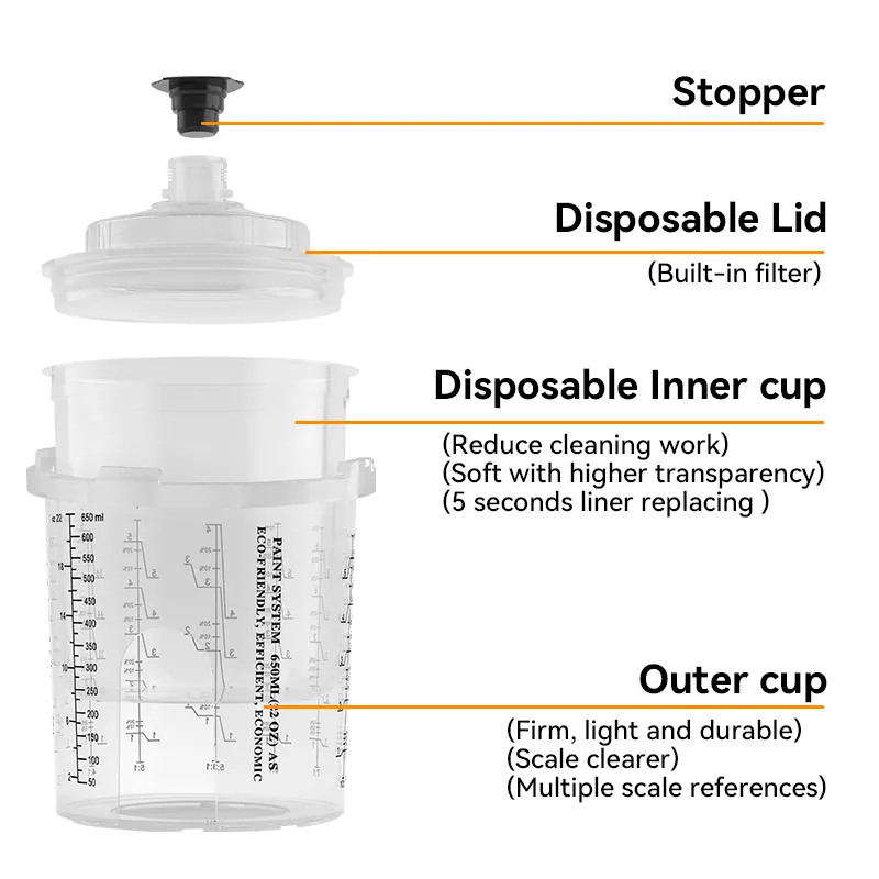 Reka bentuk cawan telus menjadikannya mudah untuk memerhatikan cat yang tinggal. Cawan semburan pakai buang memastikan bahawa pistol semburan boleh menyembur 360 darjah tanpa cat yang bocor, yang boleh mencemari permukaan bijirin kayu yang disebabkan oleh cat yang menetes. Ia sesuai untuk cat cat PU/NC di pintu kayu, kabinet, dan perabot kayu pepejal.