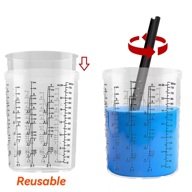 Cawan luar boleh guna semula dengan skala nisbah campuran. Masukkan pelapik pakai buang ke dalam cawan luar dan campurkan cat terus dalam pelapik. Kurangkan kos bahan dengan tidak menggunakan cawan adunan tradisional.