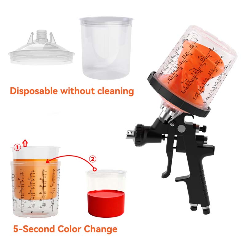 Thecawan pistol semburan pakai buang tidak memerlukan pembersihan selepas digunakan; Cukup buang cawan dalaman untuk mengubah warna dengan cepat, mengurangkan selang perubahan warna dari 20 minit hingga 5 saat, dengan berkesan menggandakan pengeluaran harian. Tudung ini mempunyai penapis halus terbina dalam untuk menapis kekotoran dengan berkesan, memastikan semburan seragam dan licin, menghasilkan penamat yang lebih tinggi.