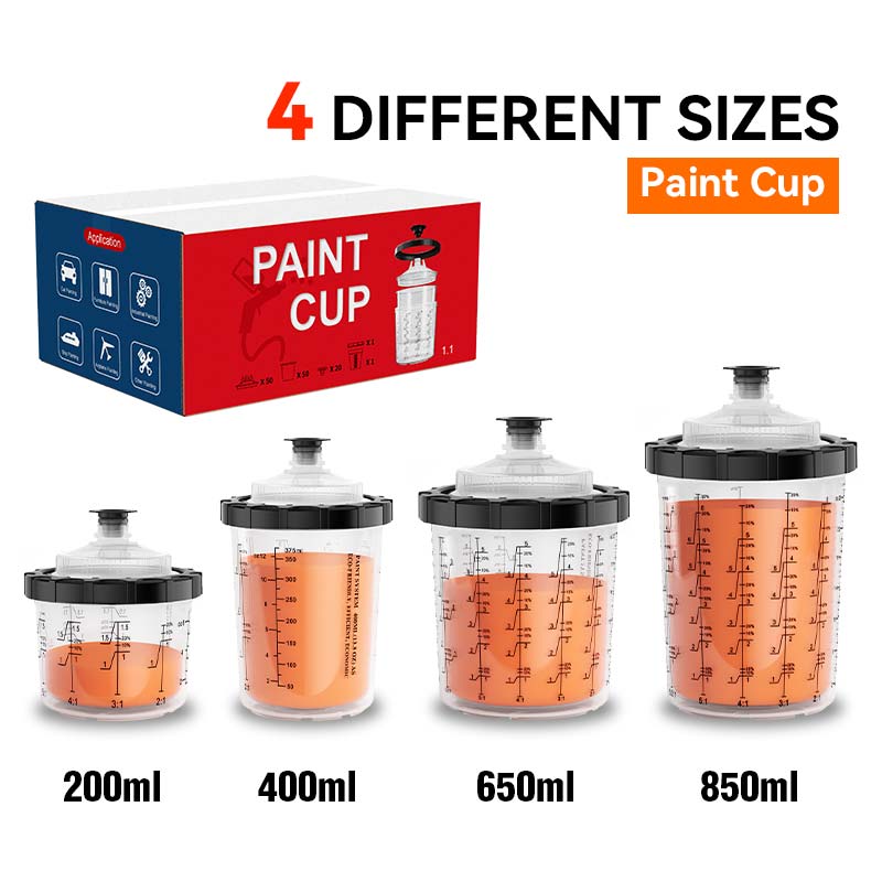 Berdasarkan penyelidikan pasaran, Piala Cat boleh didapati dalam empat spesifikasi kapasiti: 200ml, 400ml, 650ml, dan 850ml, yang memenuhi senario penggunaan yang berbeza, sama ada untuk penyemburan kawasan besar atau sentuhan terperinci. Di samping itu, struktur cawan dalaman telah dioptimumkan untuk memastikan aliran cat yang lancar, mengurangkan penyumbatan dan sisa.